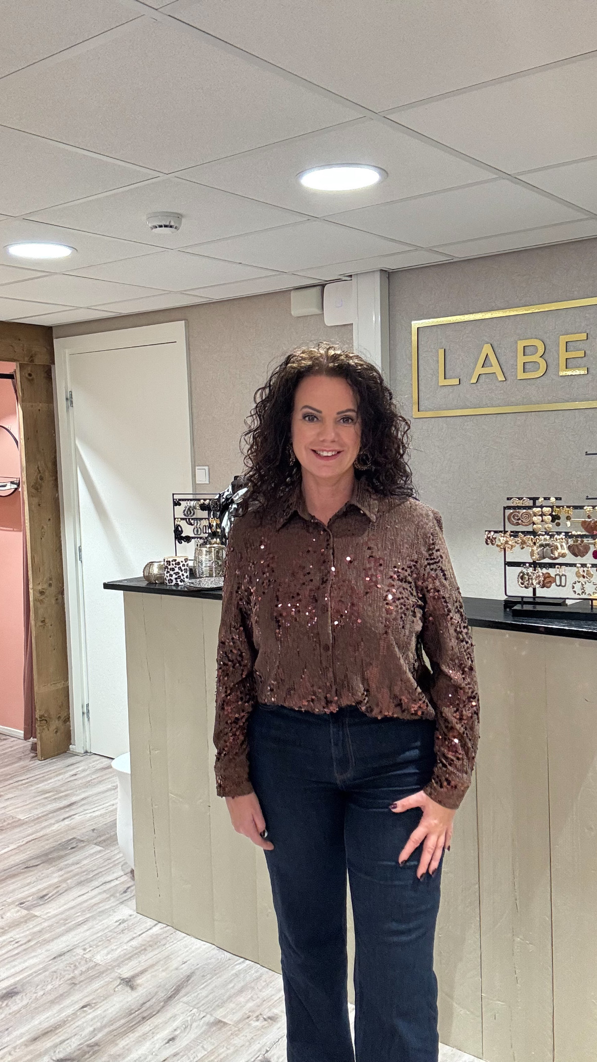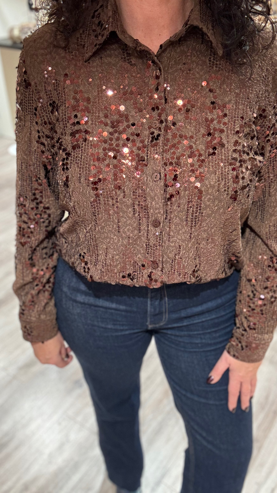 Deze prachtige blouse in een warme bruintint geeft elke outfit direct een stijlvolle upgrade. De subtiele pailletten zorgen voor een elegante sparkle zonder te overdrijven. Draag ’m moeiteloos op een spijkerbroek voor een chique maar toch casual look—perfect voor zowel overdag als in de avond.