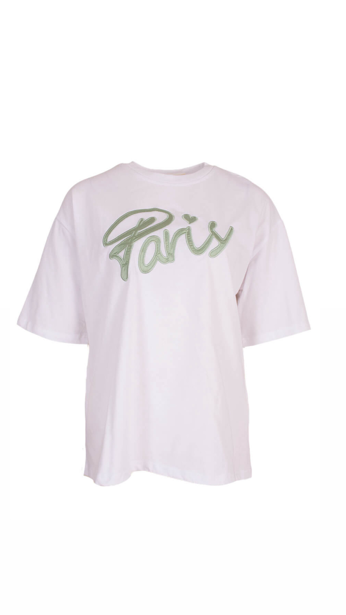 Dit stijlvolle witte T-shirt is een echte must-have voor elke garderobe. Het shirt heeft een mooi extra detail met het woord Paris dat subtiel in seagreen is geweven, wat zorgt voor een luxe en trendy uitstraling.