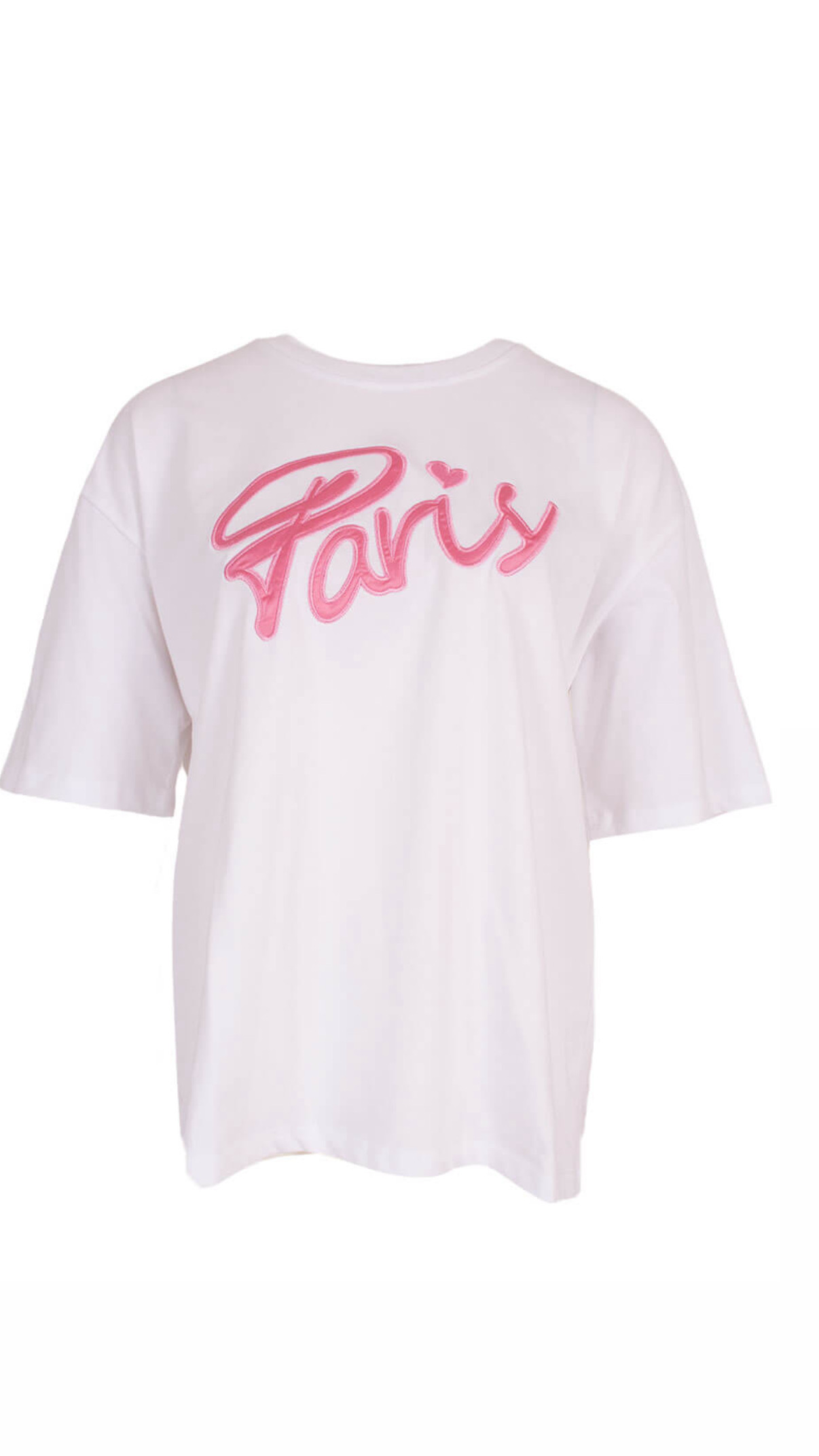 Dit stijlvolle witte T-shirt is een echte must-have voor elke garderobe. Het shirt heeft een mooi extra detail met het woord Paris dat subtiel in roze is geweven, wat zorgt voor een luxe en trendy uitstraling.